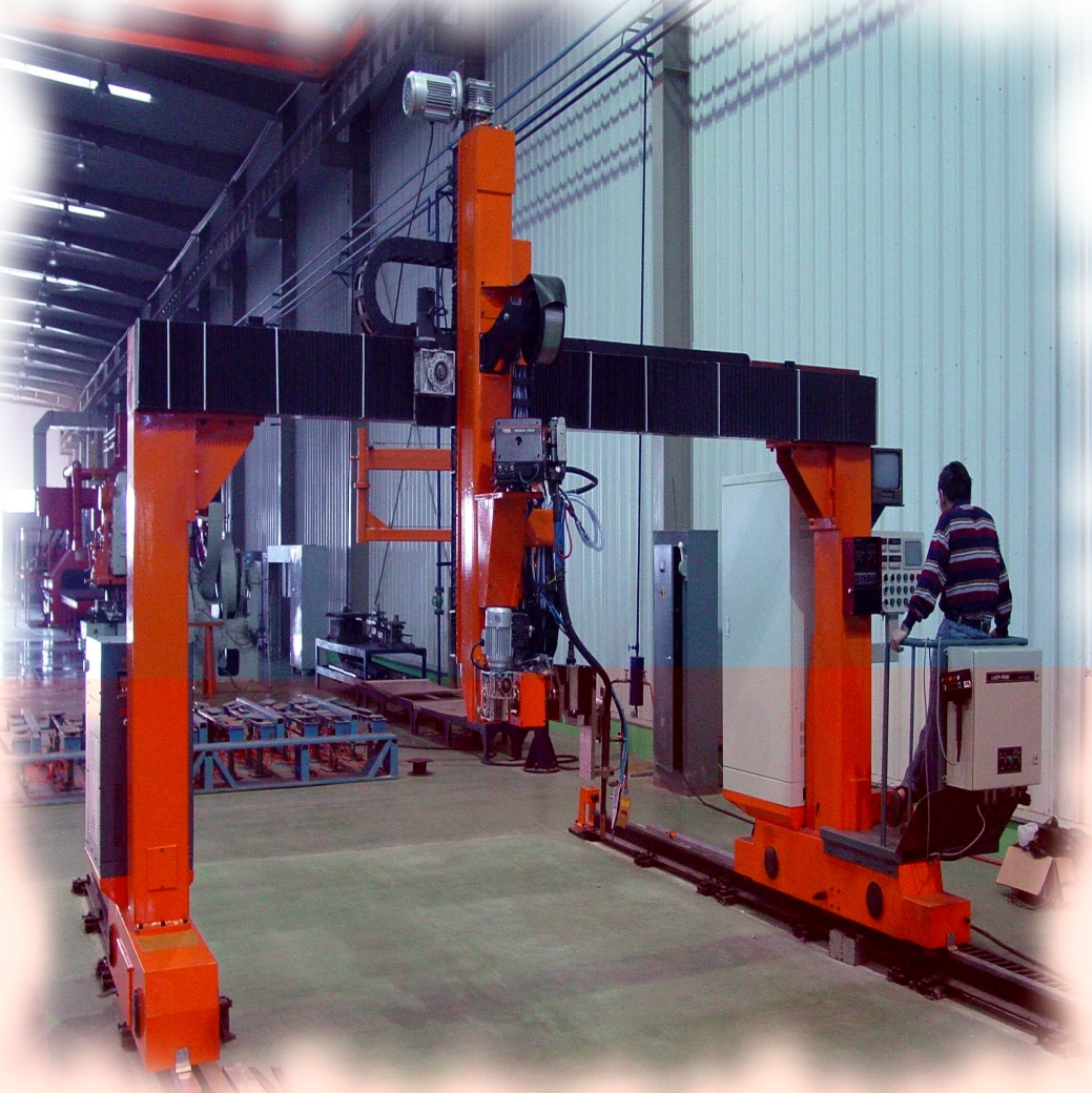 ● 龍門所配二臺(tái)焊機(jī)、保護(hù)氣氣瓶(至少2個(gè))、控制柜等均放在龍門兩側(cè)托架上,隨龍門一起移動(dòng),進(jìn)龍門的外部供電線纜采用滑線供給,使得龍門移動(dòng)范圍加大。