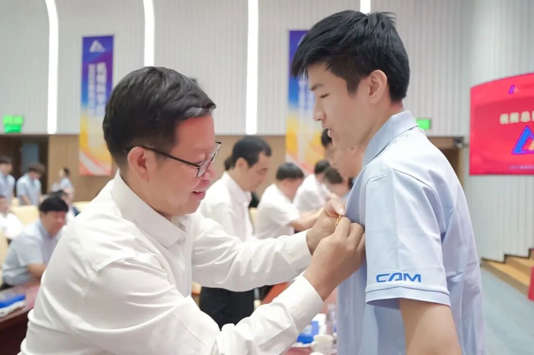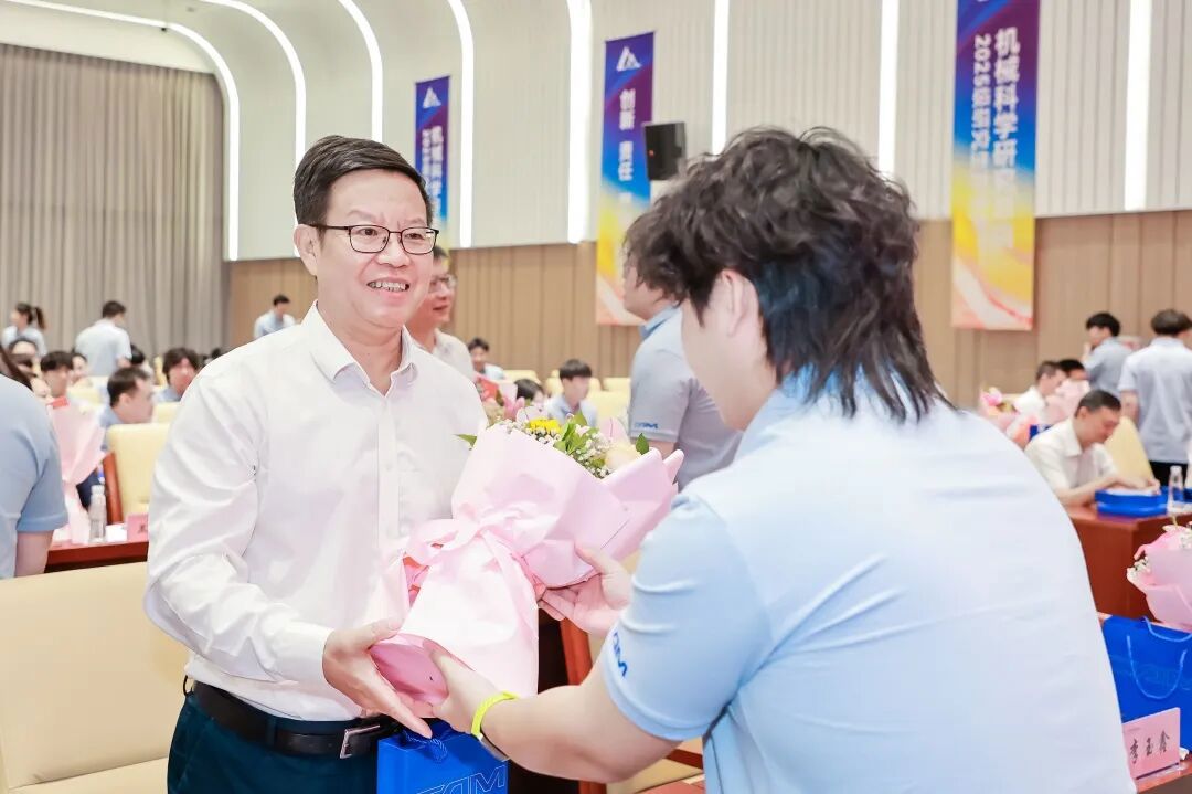 典禮上,王德成、李玉鑫及導師代表共同為新生佩戴總院徽章。這枚徽章不僅象征著中國機械總院人的身份,更承載著“以提升中國裝備制造水平為己任”的使命與榮光。優(yōu)秀導師獎、最受歡迎教師獎、新生入學獎學金和優(yōu)秀課程獎獲獎代表上臺領獎。新生代表手捧鮮花向導師們獻上誠摯敬意與節(jié)日祝福,表達莘莘學子的感激之情。