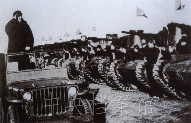 紀(jì)錄片:(群眾呼聲)中國(guó)人民萬(wàn)歲?。o(jì)錄片解說)檢閱開始了。東北野戰(zhàn)軍參謀長(zhǎng)劉亞樓將軍,向毛主席報(bào)告受檢閱的部隊(duì)全部到齊。坦克塔上飄揚(yáng)著紅旗,坦克手精神百倍,向著自己的領(lǐng)袖敬禮。